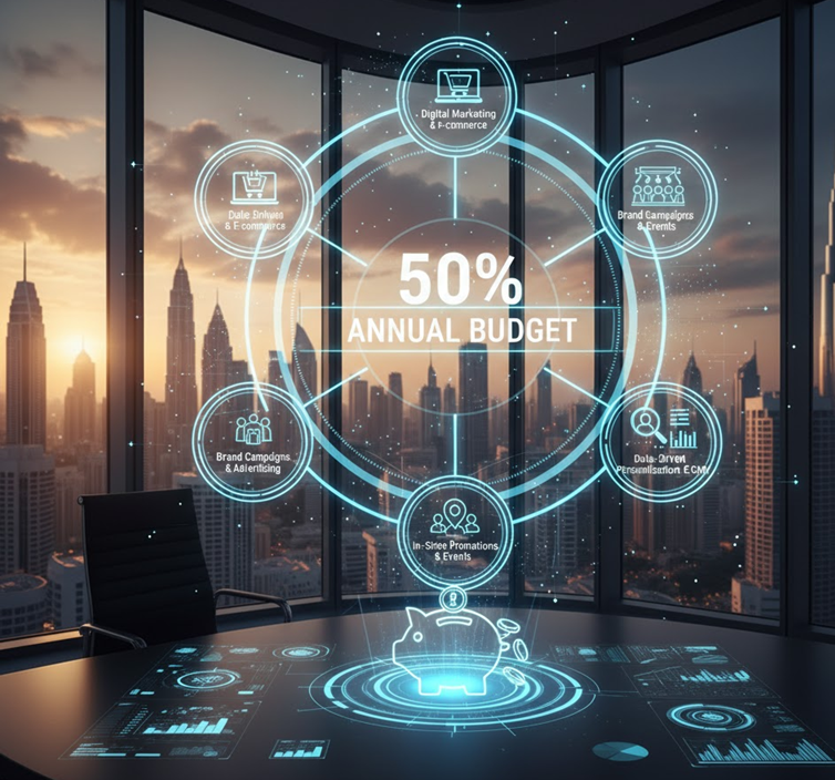 Retailers often allocate 40% to 50% of their annual budgets toward marketing. This massive investment reflects the importance of customer acquisition, retention, and brand engagement in today’s digital-first economy.